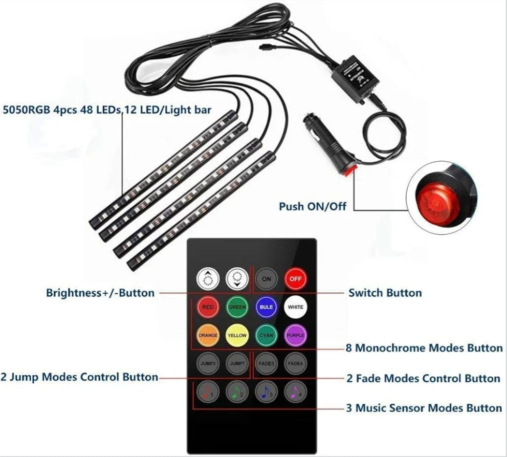 Car Interior RGB LED Strip Lights – 4PCS 12V Footwell Light Kit with Remote, Music Mode, Waterproof Flexible Strips.